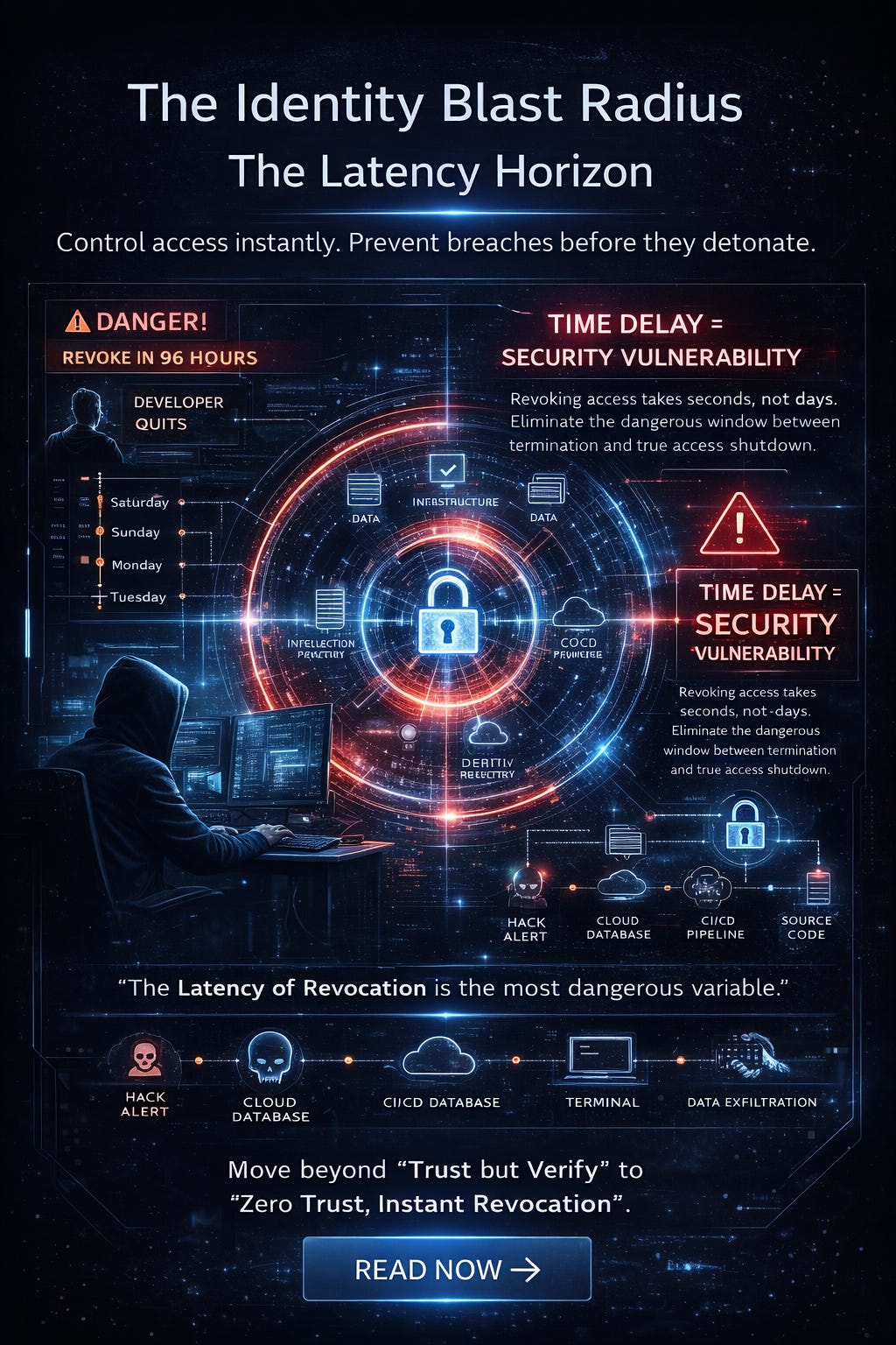 Security is not a policy. It is a physics problem. In a distributed engineering environment, the single most dangerous variable is not the sophistication of an external attacker. It is the latency of revocation. We define the Identity Blast Radius as the total volume of infrastructure, data, and intellectual property accessible to a single credential set during the delta between a termination event and the actual technical severance of access.